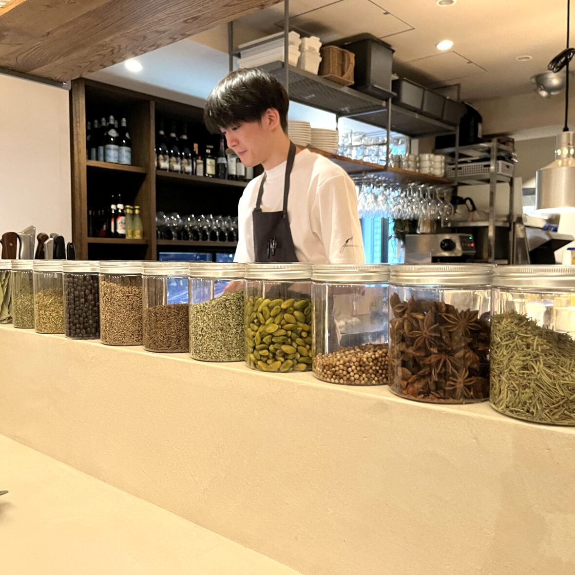 店内に並ぶ20種類以上のスパイス。しかし、こちらの料理は決して「辛い」のではありません。一皿に使うのは厳選された3〜4種。海老を茹でる際にもスパイスを加えるなど、素材本来の香りを引き立てる「隠し味」として計算し尽くされています。赤ワインの酸味や香りを活かしたソースは、驚くほどスッキリとした後味。毎日でも食べたくなる体に優しい仕上がりです。